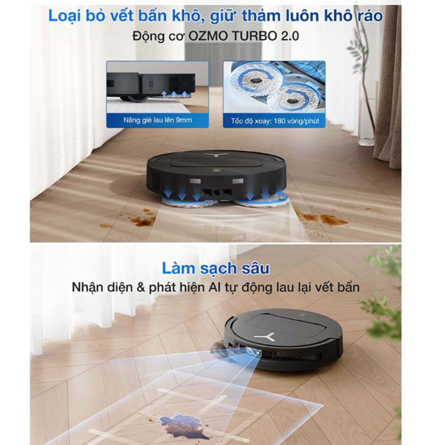 - OZMO™ Turbo 2.0 + AI tự lau lại: xử lý vết bẩn tốt hơn, giảm lau tay