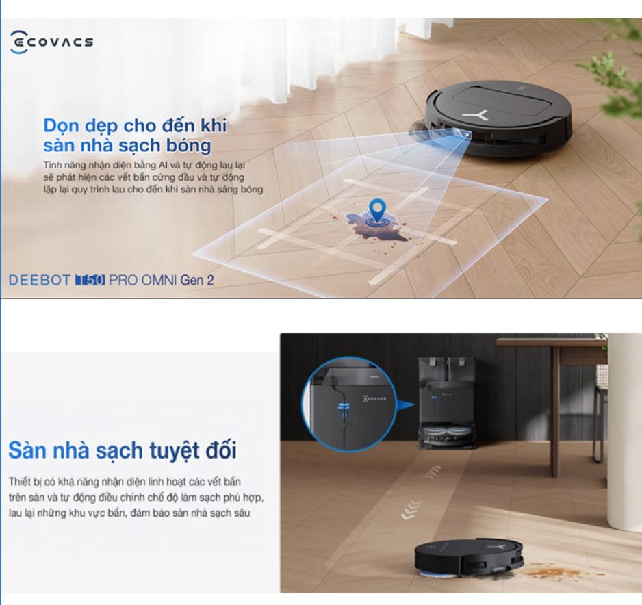 Điểm nâng cấp đáng giá ở T50 Pro Omni Gen 2 là robot không “lau đồng loạt cho có”, mà biết chỗ nào bẩn để làm kỹ hơn. Nhờ AI nhận diện độ bẩn, robot có thể ưu tiên xử lý vùng có vết bẩn rõ thay vì lau một lượt rồi bỏ qua.