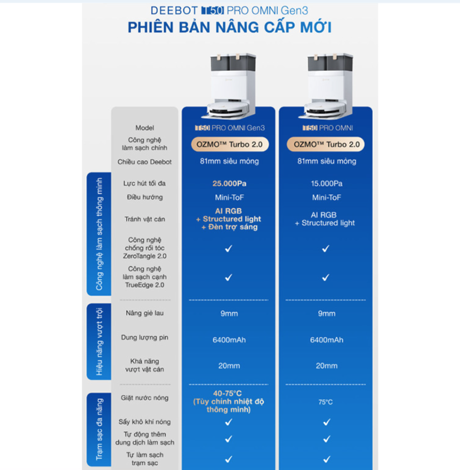 Với những công nghệ nổi bật như TruEdge 2.0, AIVI 3D 3.0 OMNI, ZeroTangle 3.0, OZMO Turbo 2.0, TrueMapping 2.0 cùng trạm OMNI đa năng, Ecovacs Deebot T50 Pro Omni Gen 3 không chỉ là thiết bị dọn dẹp mà còn là trợ lý vệ sinh thông minh cho gia đình hiện đại. Đây là sản phẩm phù hợp với người dùng muốn đầu tư vào một giải pháp làm sạch tiện lợi, cao cấp và tiết kiệm thời gian lâu dài.
