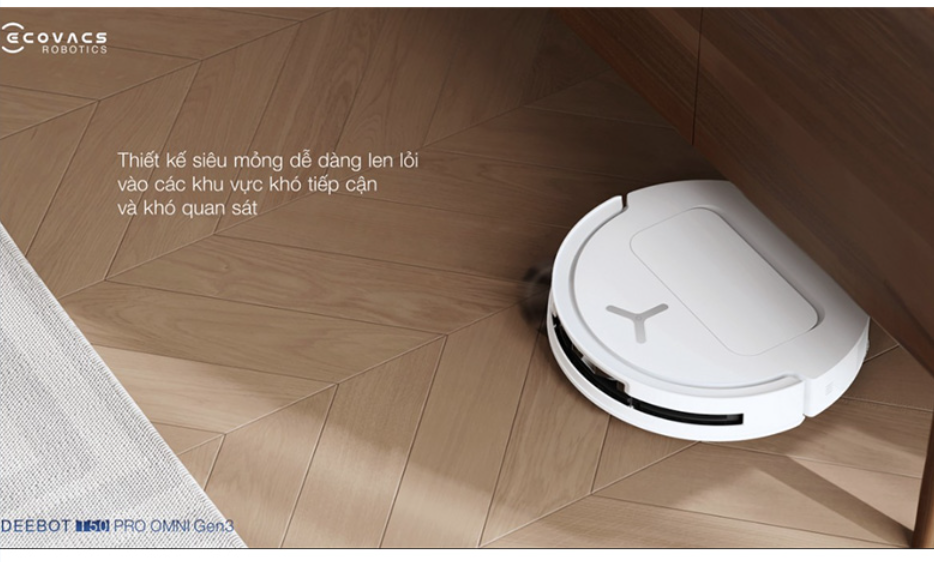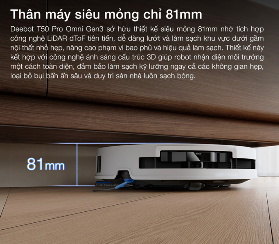 Một trong những điểm nổi bật đầu tiên của Ecovacs Deebot T50 Pro Omni Gen 3 – Bản Quốc Tế là thiết kế siêu mỏng chỉ 81mm. Với chiều cao tối ưu này, robot có thể dễ dàng đi sâu vào những khu vực thấp như gầm giường, gầm sofa, gầm tủ và các khoảng hẹp mà nhiều robot hút bụi thông thường khó tiếp cận.