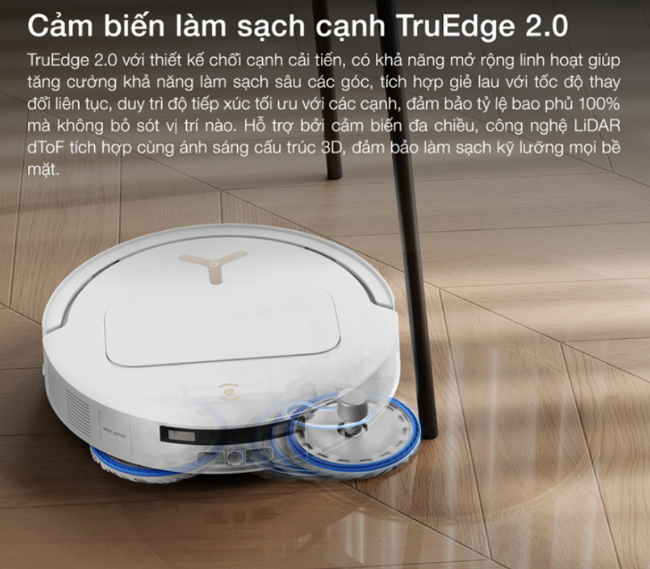 TruEdge 2.0 là công nghệ đáng chú ý giúp Robot hút bụi lau nhà Ecovacs Deebot T50 Pro Omni Gen 3 nâng cao hiệu quả làm sạch tại các khu vực sát mép tường, góc nhà và chân nội thất. Đây vốn là những vị trí mà robot thông thường rất dễ bỏ sót do giới hạn về thiết kế cụm lau hoặc khoảng cách thân máy.