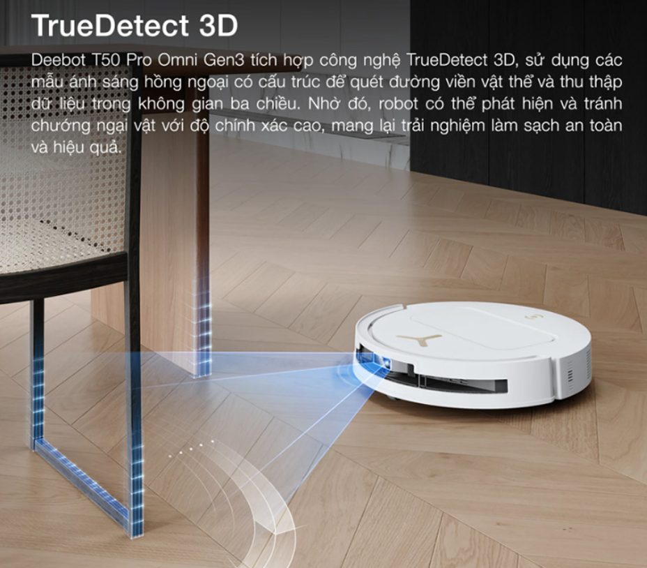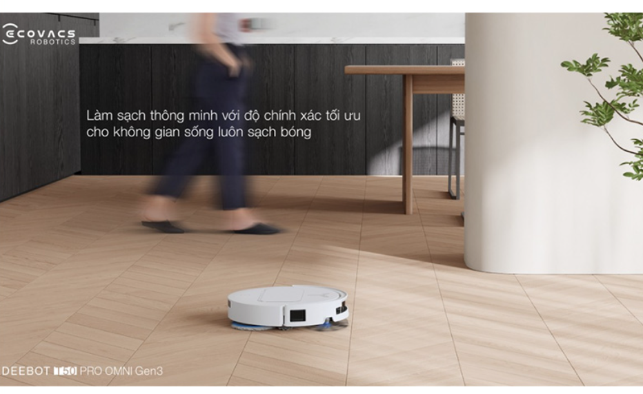 Ecovacs Deebot T50 Pro Omni Gen 3 được tích hợp công nghệ AIVI 3D 3.0 OMNI, cho phép robot nhận diện vật cản thông minh và phản ứng linh hoạt trong quá trình di chuyển. Hệ thống này giúp robot quan sát tốt hơn môi trường xung quanh, xác định vật thể trên sàn và chủ động điều chỉnh lộ trình phù hợp.