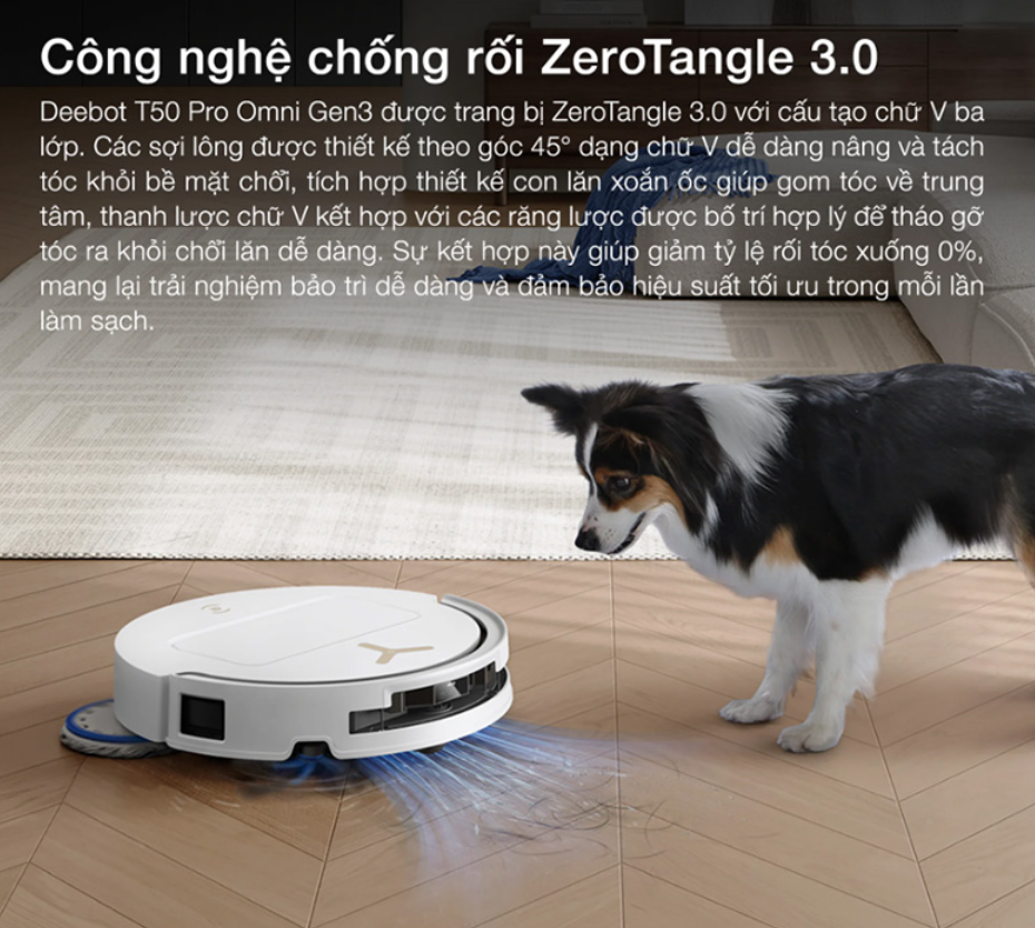 Một trong những vấn đề phổ biến khi sử dụng robot hút bụi là tóc hoặc lông thú cưng quấn vào chổi, làm giảm hiệu suất làm sạch và tăng công vệ sinh thủ công. Với ZeroTangle 3.0, Ecovacs Deebot T50 Pro Omni Gen 3 – Bản Quốc Tế được tối ưu để giảm tối đa tình trạng này.