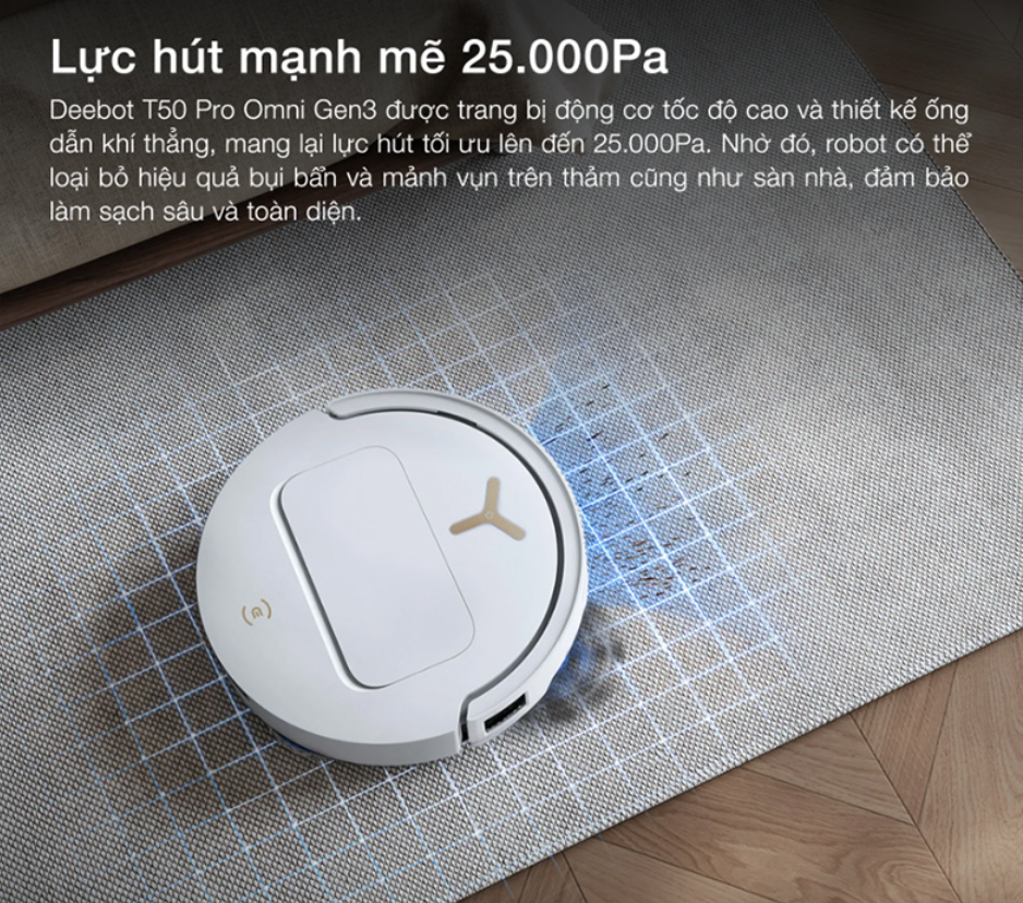 Điểm nhấn rất mạnh của Robot hút bụi lau nhà Ecovacs Deebot T50 Pro Omni Gen 3 là lực hút lên tới 25.000Pa. Đây là mức lực hút cao, cho phép robot xử lý hiệu quả nhiều loại bụi bẩn khác nhau như bụi mịn, tóc rụng, lông thú cưng, vụn thức ăn và rác nhỏ trên sàn.