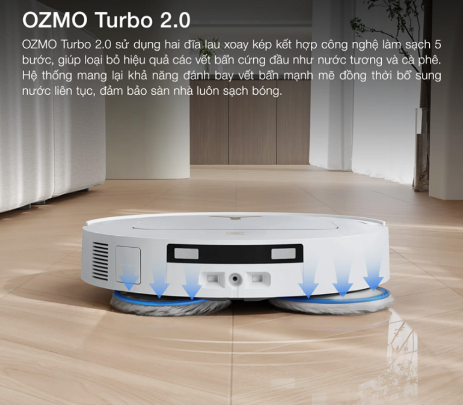 Bên cạnh khả năng hút mạnh, Ecovacs Deebot T50 Pro Omni Gen 3 còn được trang bị công nghệ lau OZMO Turbo 2.0, giúp tăng hiệu quả xử lý các vết bẩn bám trên bề mặt sàn. So với kiểu lau kéo thông thường, cơ chế lau tiên tiến này giúp robot tác động tốt hơn lên vết bẩn, từ đó tăng độ sạch sau mỗi lần vận hành.