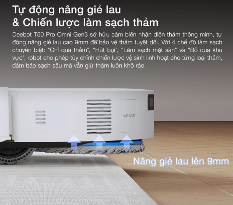 Ecovacs Deebot T50 Pro Omni Gen 3 – Bản Quốc Tế còn được tối ưu cho không gian có thảm nhờ khả năng nhận diện thảm thông minh và tự động nâng giẻ lau khi di chuyển lên bề mặt thảm. Đây là tính năng quan trọng trong những ngôi nhà kết hợp giữa sàn cứng và thảm trang trí.