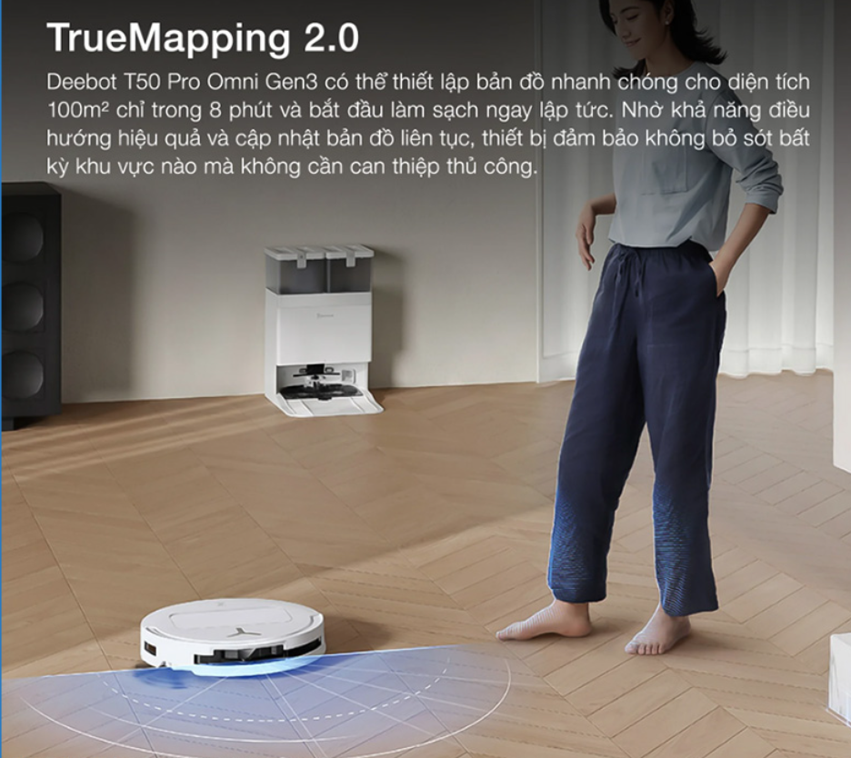 Để nâng cao hiệu suất vận hành, Robot hút bụi lau nhà Ecovacs Deebot T50 Pro Omni Gen 3 được tích hợp TrueMapping 2.0. Công nghệ này cho phép robot lập bản đồ nhanh, xác định bố cục ngôi nhà chính xác và tối ưu lộ trình làm sạch một cách thông minh hơn.