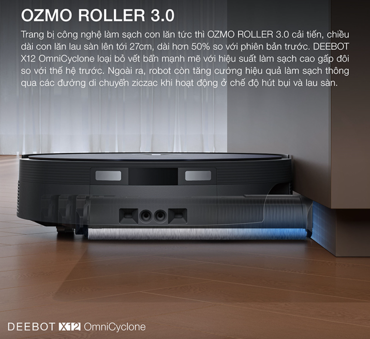 Sở hữu công nghệ lau sàn OZMO ROLLER 3.0 được cải tiến, robot hút bụi lau nhà Ecovacs DEEBOT X12 OmniCyclone sở hữu hiệu quả lau sàn vượt trội so với các thế hệ tiền nhiệm: