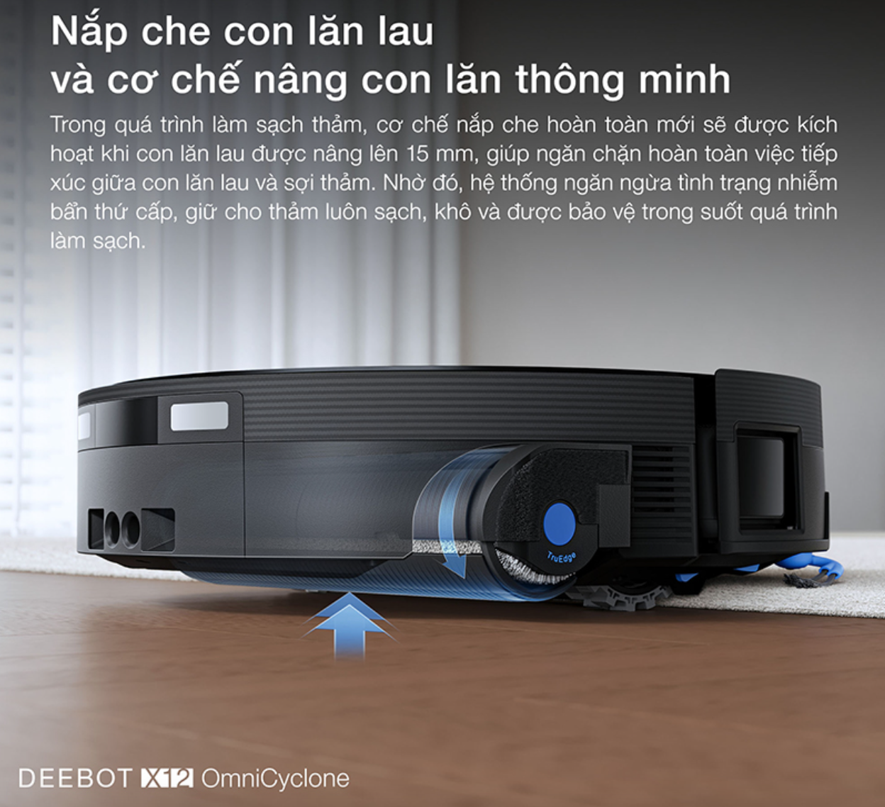 Robot hút bụi Ecovacs DEEBOT X12 OmniCyclone bảo vệ thảm tuyệt đối với nắp che con lăn