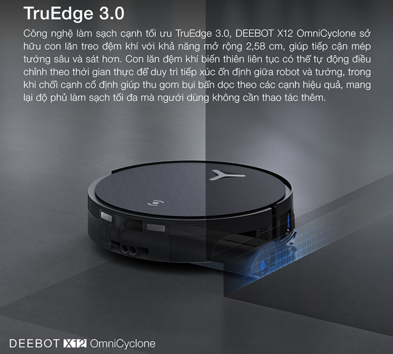Khả năng dọn dẹp các góc khuất và mép tường trên robot hút bụi lau nhà X12 OmniCyclone được nâng cấp mạnh mẽ nhờ công nghệ TruEdge 3.0. Với thiết kế con lăn treo đệm khí có khả năng mở rộng thêm 2.58cm, giúp robot Ecovacs Deebot X12 OmniCyclone tiếp cận sát và sâu hơn vào các mép tường.