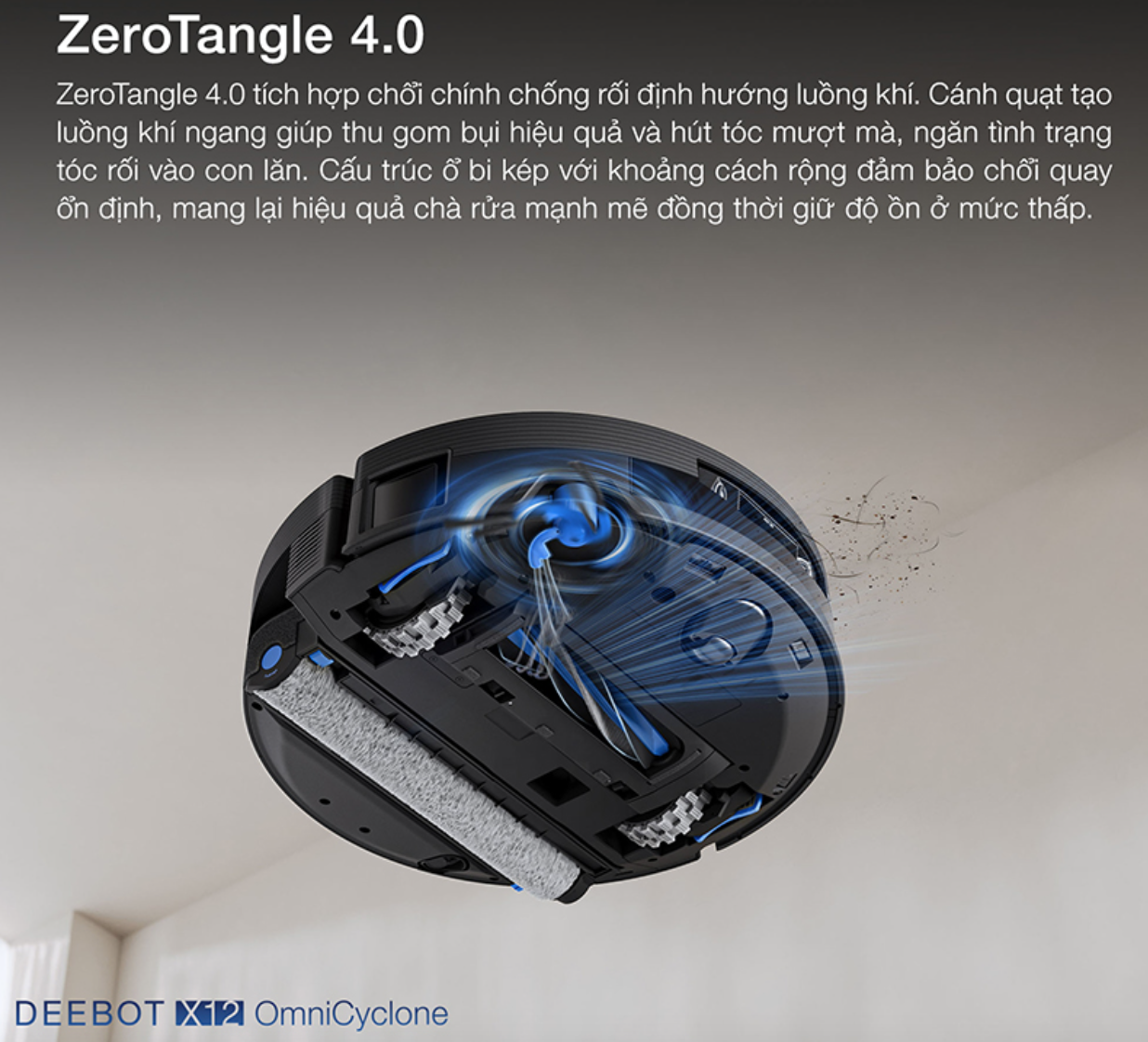 Công nghệ chống rối ZeroTangle 4.0 trên robot hút bụi lau nhà Ecovacs DEEBOT X12 OmniCyclone nâng tầm trải nghiệm làm sạch sâu một cách hoàn hảo, nhờ thiết kế ống dẫn khí thẳng trực tiếp giúp tối ưu hóa luồng hút mạnh mẽ. Điểm đột phá của thế hệ 4.0 này nằm ở chổi chính được tinh chỉnh để điều hướng luồng khí kết hợp cùng các cánh quạt tạo luồng khí ngang, giúp thu gom bụi bẩn và hút tóc rụng một cách nhẹ nhàng, ngăn ngừa tình trạng tóc quấn vào chổi nhanh chóng.