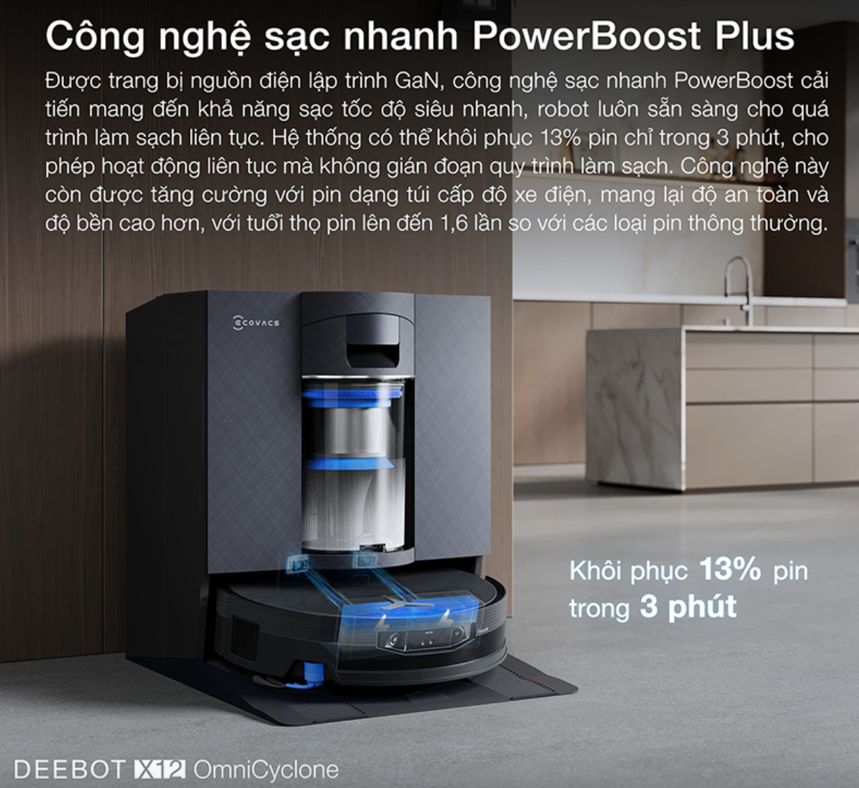 Công nghệ sạc nhanh PowerBoost Plus trên robot hút bụi DEEBOT X12 OmniCyclone