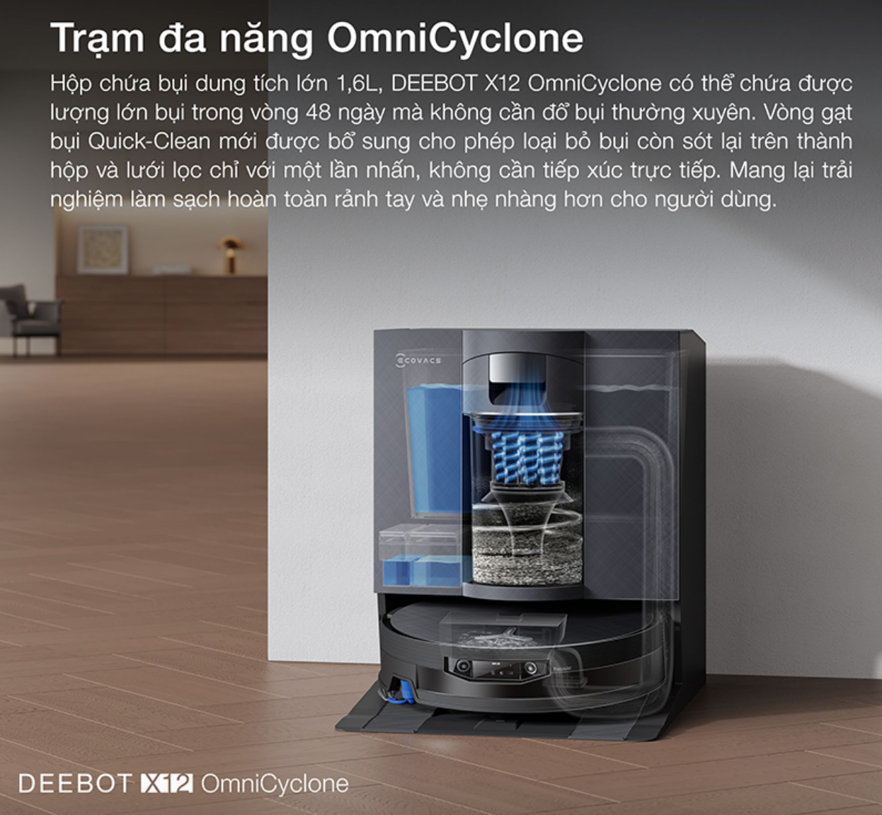 Với hộp chứa bụi dung tích 1.6 lít, robot hút bụi lau nhà Ecovacs DEEBOT X12 OmniCyclone có thể hoạt động liên tục lên tới 48 ngày mà không cần người dùng đổ rác thường xuyên. Đặc biệt, vòng gạt bụi Quick-clean hoàn toàn mới cho phép bạn loại bỏ sạch bụi bẩn còn sót lại trên lưới lọc và thành thùng chứa chỉ với một thao tác nhấn, giúp việc vệ sinh trở nên dễ dàng và đảm bảo sự sạch sẽ tối đa mà không cần tiếp xúc trực tiếp với bụi.