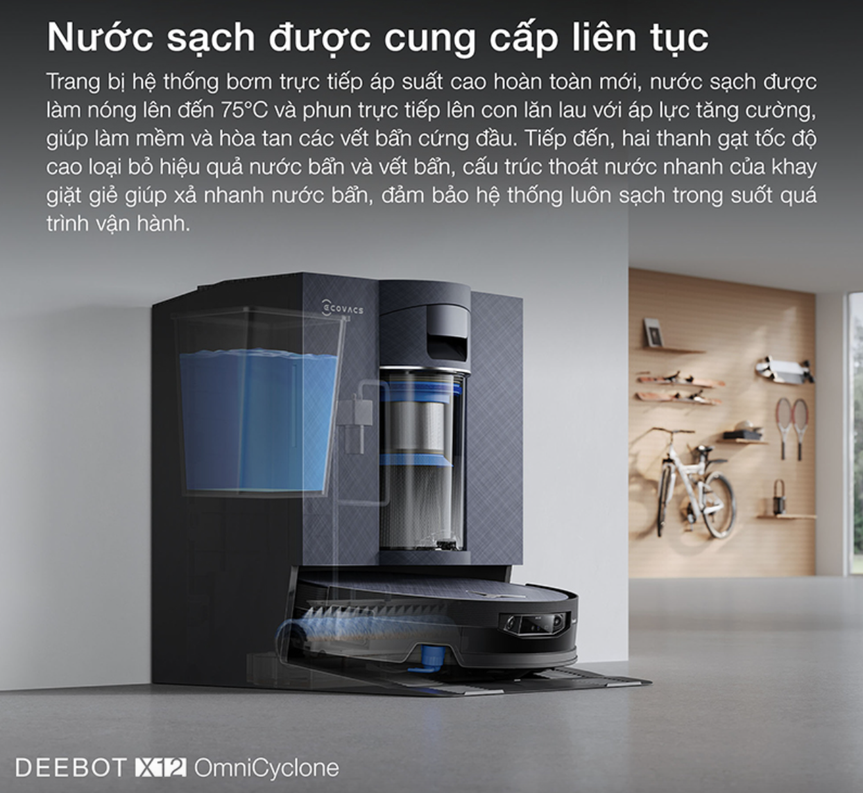 DEEBOT X12 OmniCyclone với hệ thống làm sạch con lăn bằng nước nóng chuyên sâu