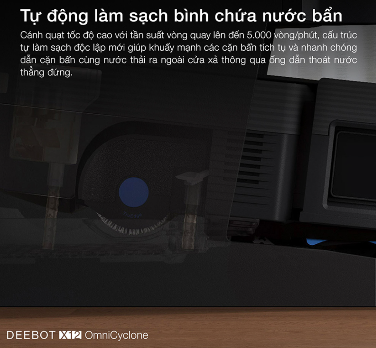 Tính năng tự động làm sạch bình chứa nước bẩn trên robot Ecovacs DEEBOT X12 OmniCyclone mang đến giải pháp vệ sinh vượt trội nhờ cấu trúc làm sạch độc lập hoàn toàn mới. Cánh quạt tốc độ cao quay lên đến 5.000 vòng/phút, khuấy động mạnh mẽ mọi cặn bẩn tích tụ, từ đó nhanh chóng dẫn toàn bộ nước thải và cặn bẩn qua đường ống thoát thẳng đứng. Kết hợp một cùng ống thoát nước đặt biệt lập phía trước con lăn lau giúp ngăn chặn tuyệt đối tình trạng nước bẩn tiếp xúc ngược trở lại, loại bỏ hiệu quả sự tích tụ của mùi hôi khó chịu.
