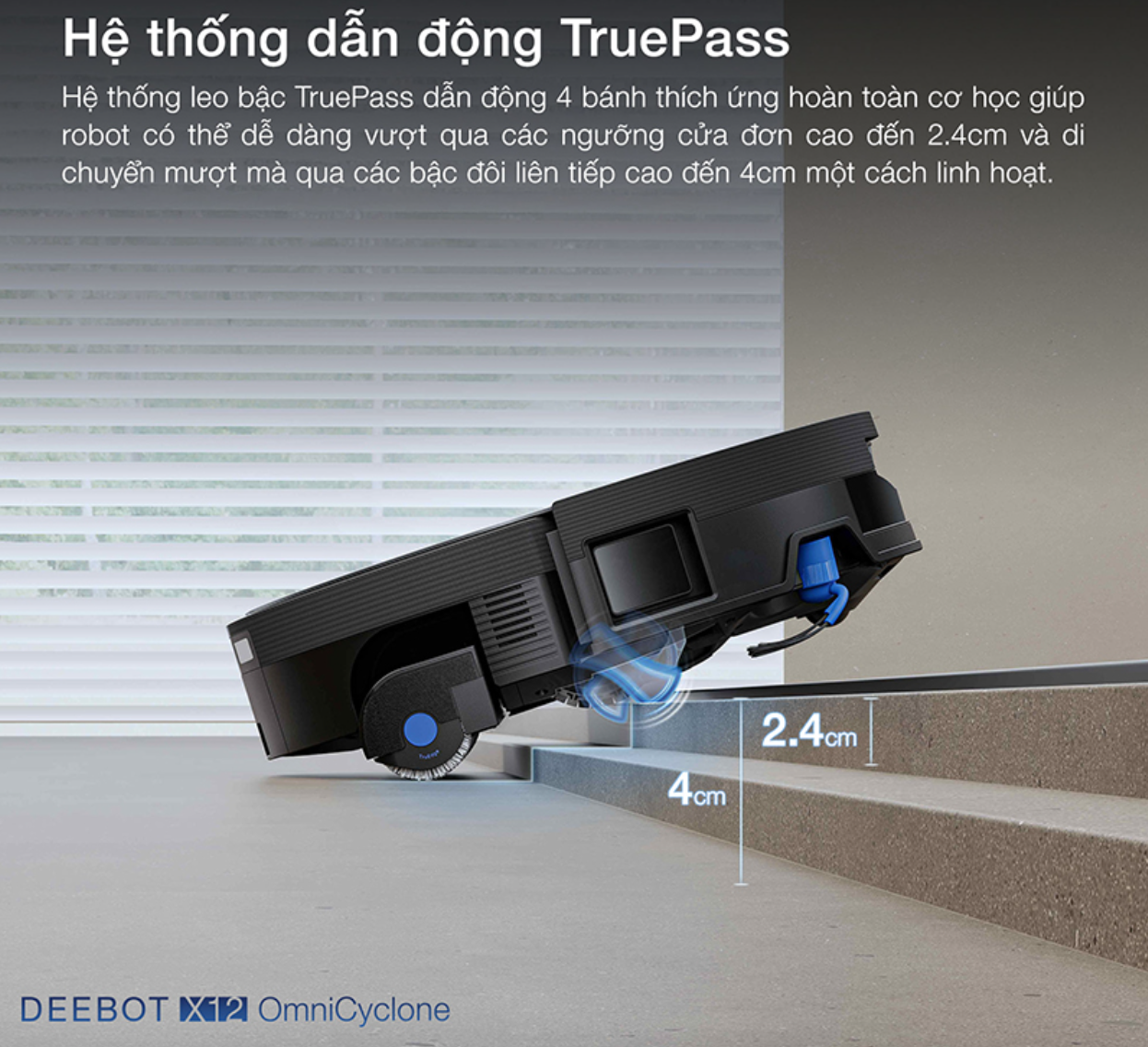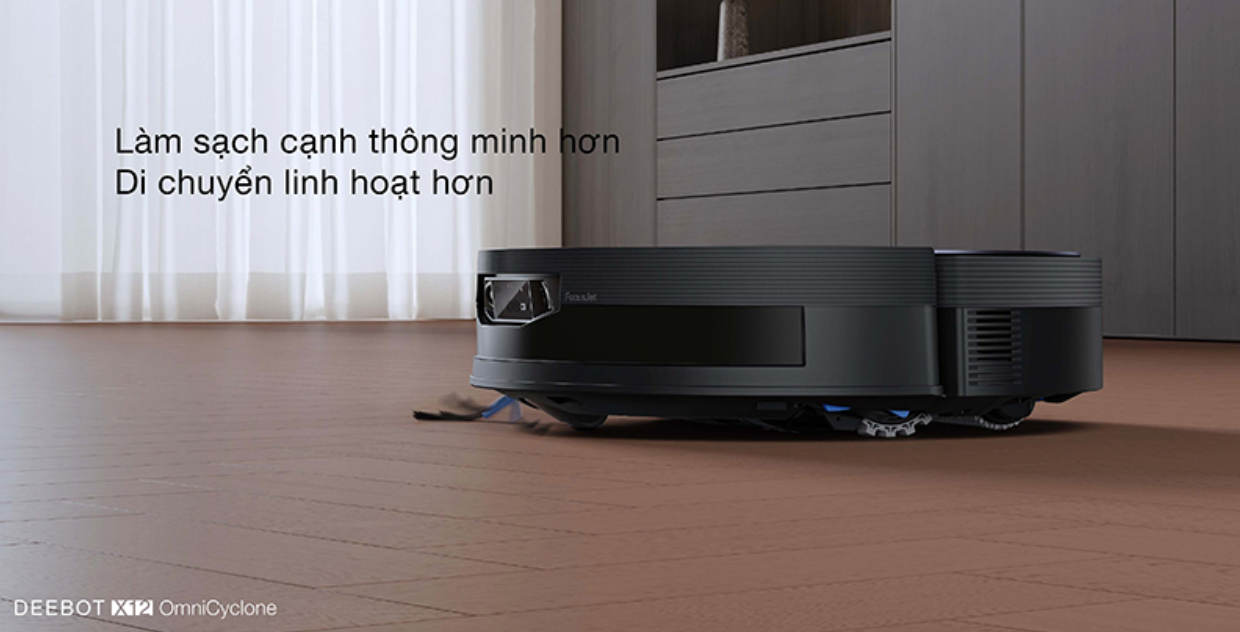Nhờ hệ thống dẫn động 4 bánh TruePass, robot hút bụi DEEBOT X12 OmniCyclone dễ dàng leo qua các gờ cửa hoặc bậc thấp. Công nghệ AIVI 3D 4.0 giúp robot nhận diện chính xác các viền cạnh vật thể trong thời gian thực, từ đó điều hướng thông minh và lau sát mép sàn một cách an toàn.