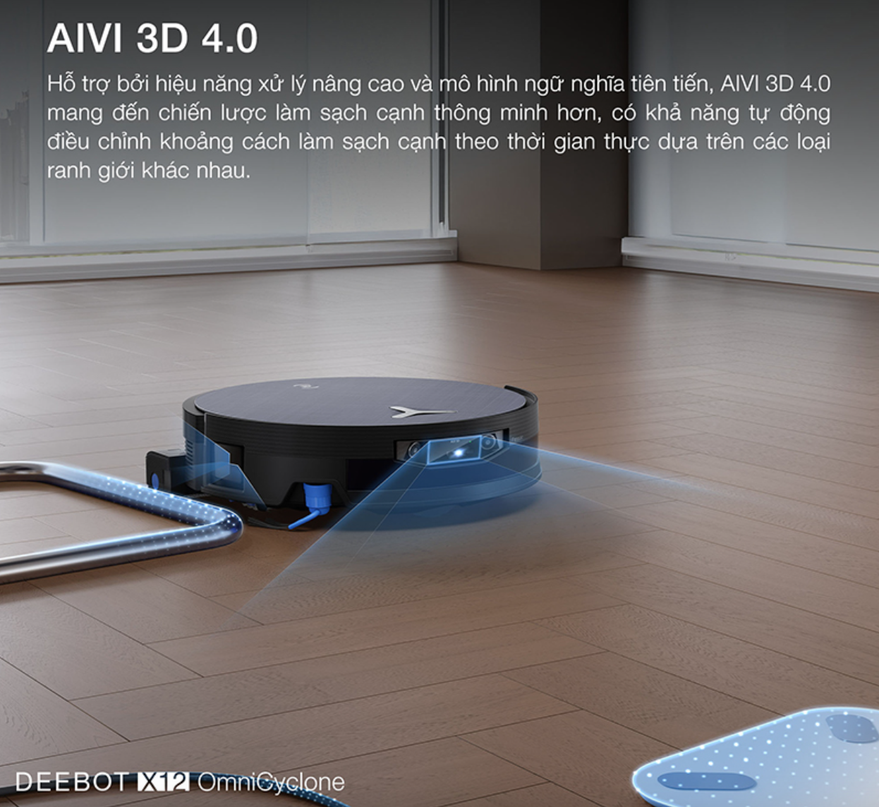 Hệ thống AIVI 3D 4.0 tích hợp hiệu năng tính toán nâng cao cùng mô hình ngữ nghĩa tiên tiến, giúp robot hút bụi lau nhà X12 OmniCyclone thiết lập chiến lược làm sạch thông minh hơn, tự động điều chỉnh khoảng cách làm sạch cạnh theo thời gian thực trên các loại ranh giới khác nhau.