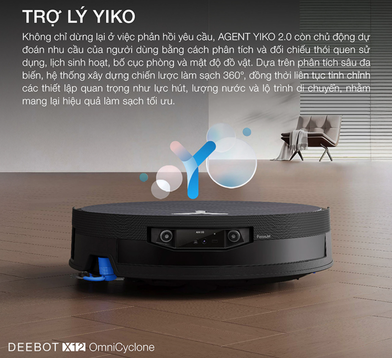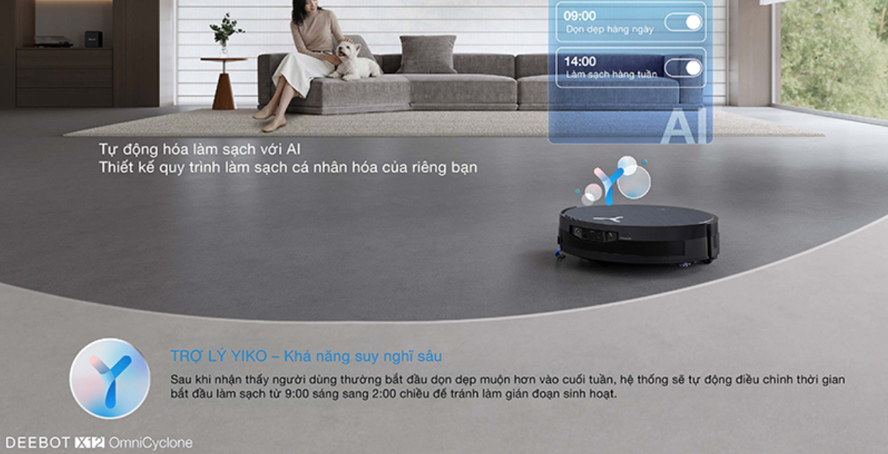 Trợ lý ảo YIKO 2.0 trên robot hút bụi lau nhà DEEBOT X12 OmniCyclone đại diện cho bước tiến đột phá về khả năng suy luận logic, chủ động phân tích không gian và thói quen sinh hoạt của gia đình thay vì chỉ phản hồi các mệnh lệnh đơn thuần. Hệ thống này tự động thiết lập bản đồ ngôi nhà, nhận diện bối cảnh thông minh để phân loại bề mặt sàn, từ đó tự xây dựng lịch trình và chiến lược dọn dẹp tối ưu theo từng tuần.