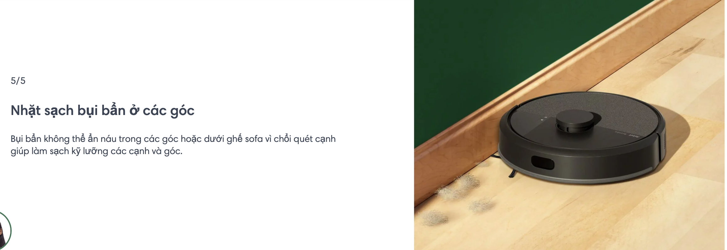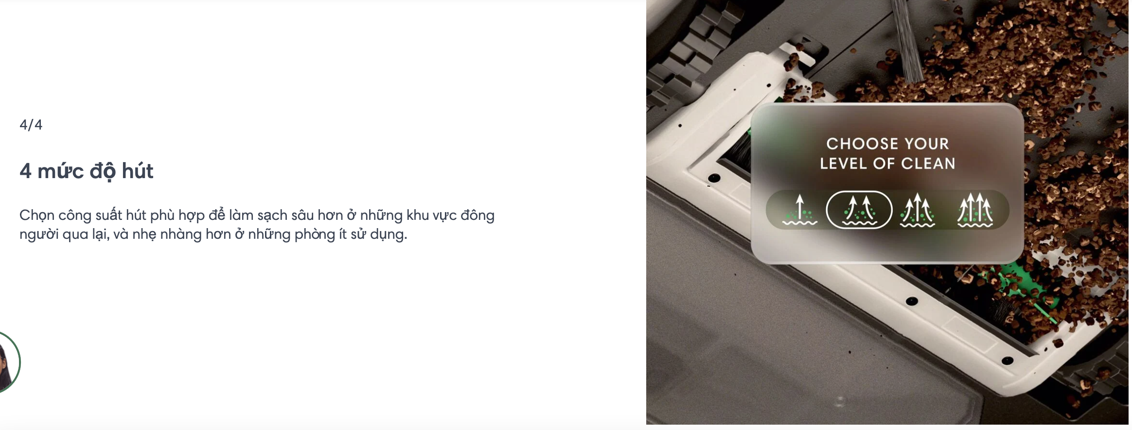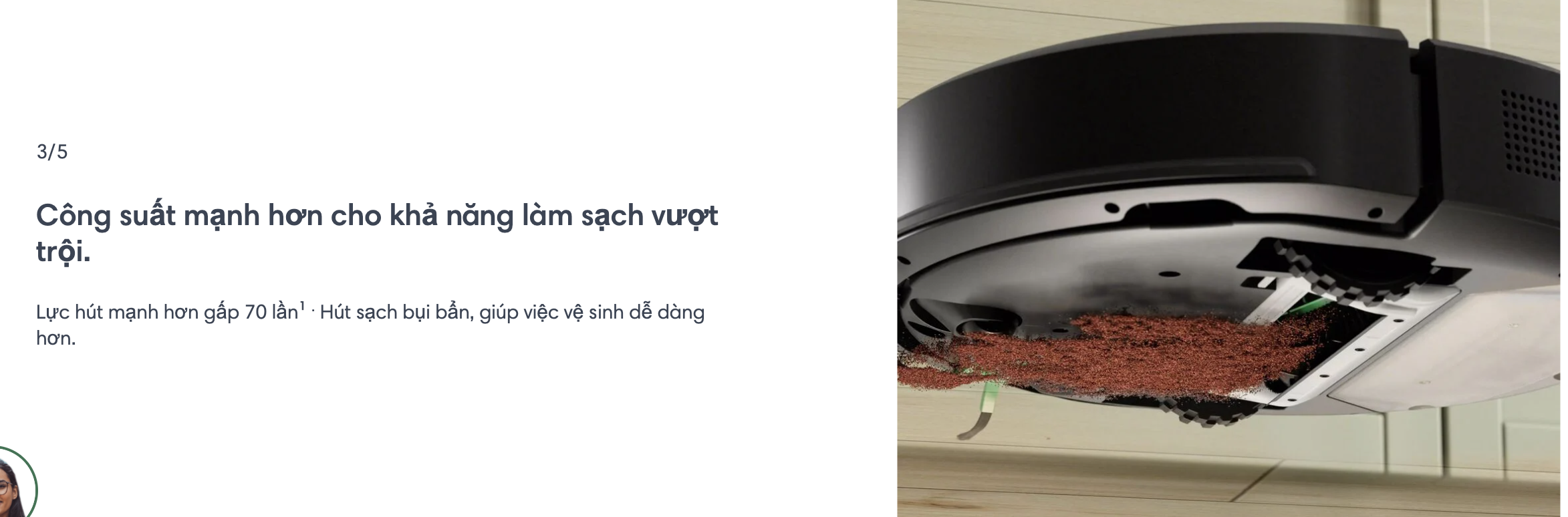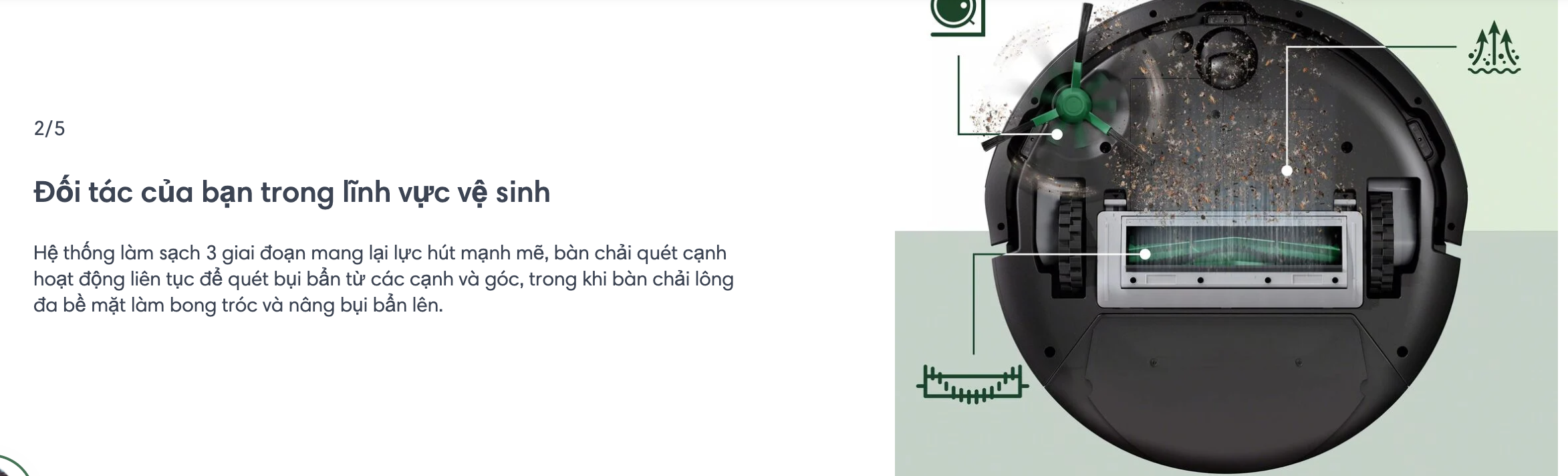 Công nghệ làm sạch 3 giai đoạn bao gồm lực hút mạnh gấp 70 lần¹ , bàn chải lông đa bề mặt và bàn chải quét cạnh để hút sạch bụi bẩn và mang lại sàn nhà sạch bong kin kít.
