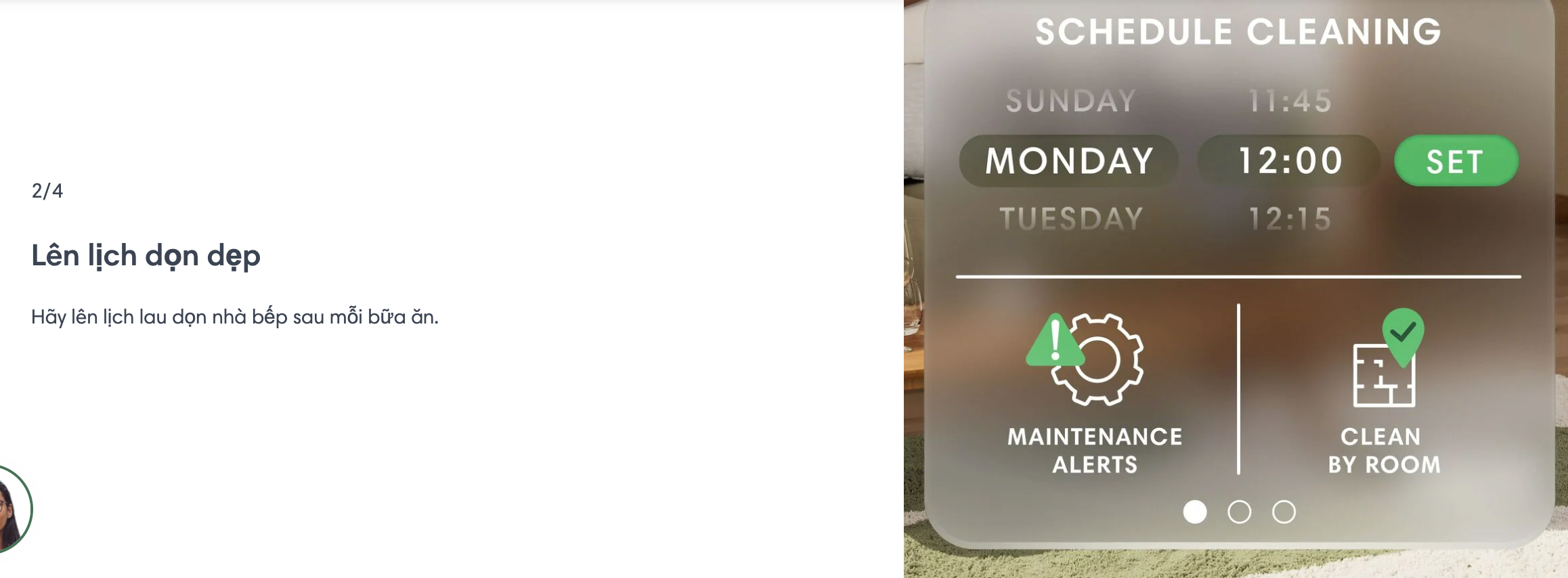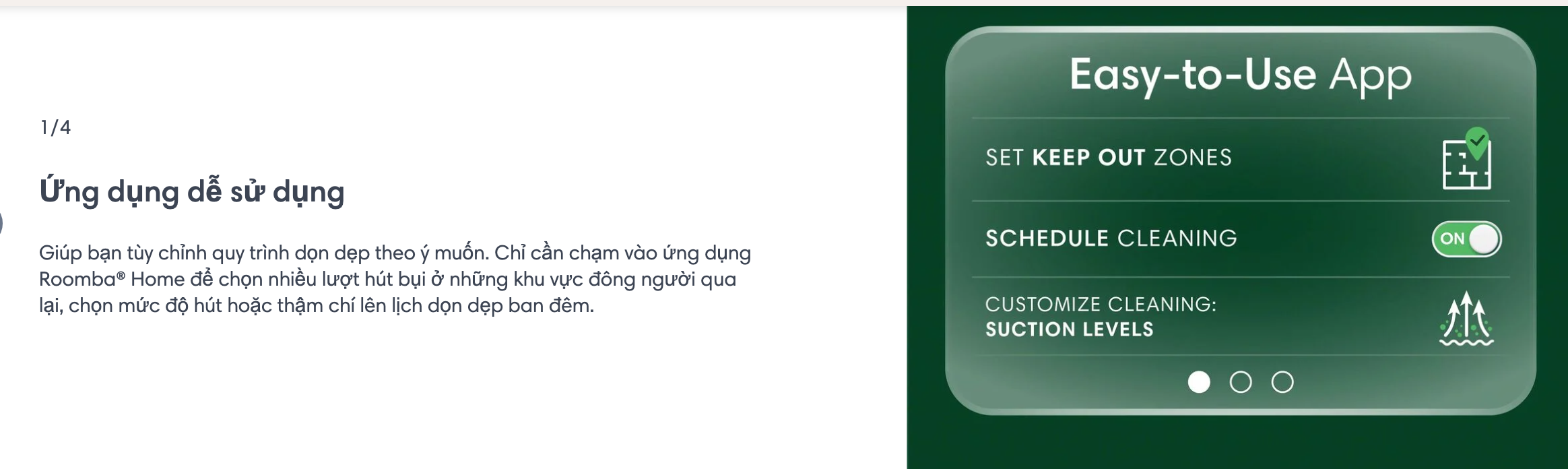 và chọn phòng mục tiêu dựa trên thói quen hàng ngày của bạn, điều chỉnh số lần dọn dẹp và mức độ lực hút.